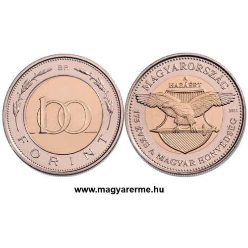 Az eszmeiség vizuális megjelenítésének keretet adnak a feliratok. Az érme belső magjában a Magyar Honvédség jelmondata: „A HAZÁÉRT” felirat, a külső körgyűrűben, gyöngysorszegélyen belül, köriratban fent a „MAGYARORSZÁG”, lent a „175 éves a MAGYAR HONVÉDSÉG” felirat, valamint a „2023” verési évszám olvasható.