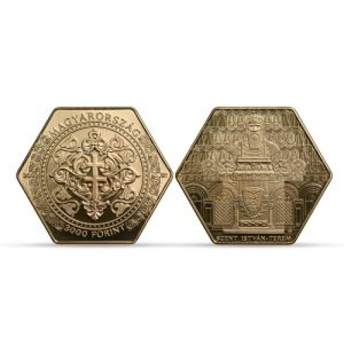 Előlap: A Szent István-terem emlékérme előoldalán az újjászületett terem falikárpitjának körre komponált részlete látható, középpontjában az apostoli kettős kereszttel, körülötte a kárpit egyéb díszítő elemeivel. Az előlapon találhatóak a törvényes fizetőeszközök kötelező elemei: a díszítő motívumot megszakítva, félköriratban fent „MAGYARORSZÁG” felirat, lent a „3000 FORINT” értékjelzés, a bal szélen a „2022” verési évszám, a jobb szélen a „BP.” verdejel látható.